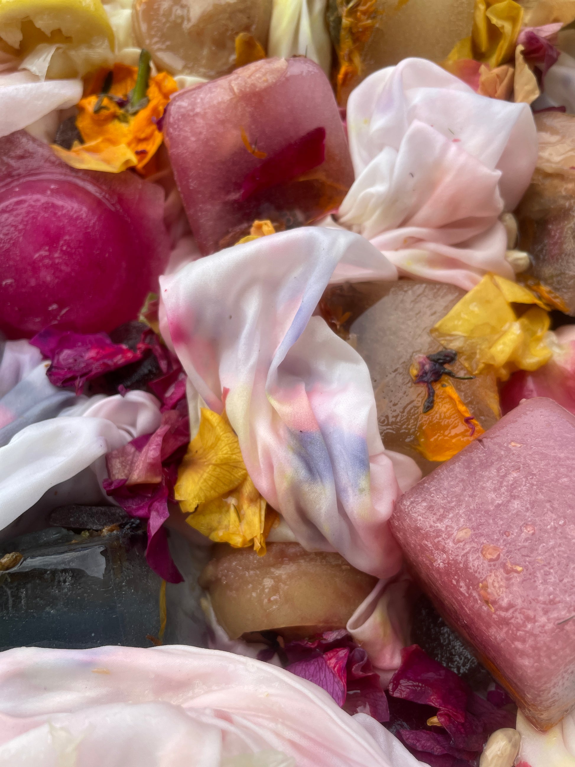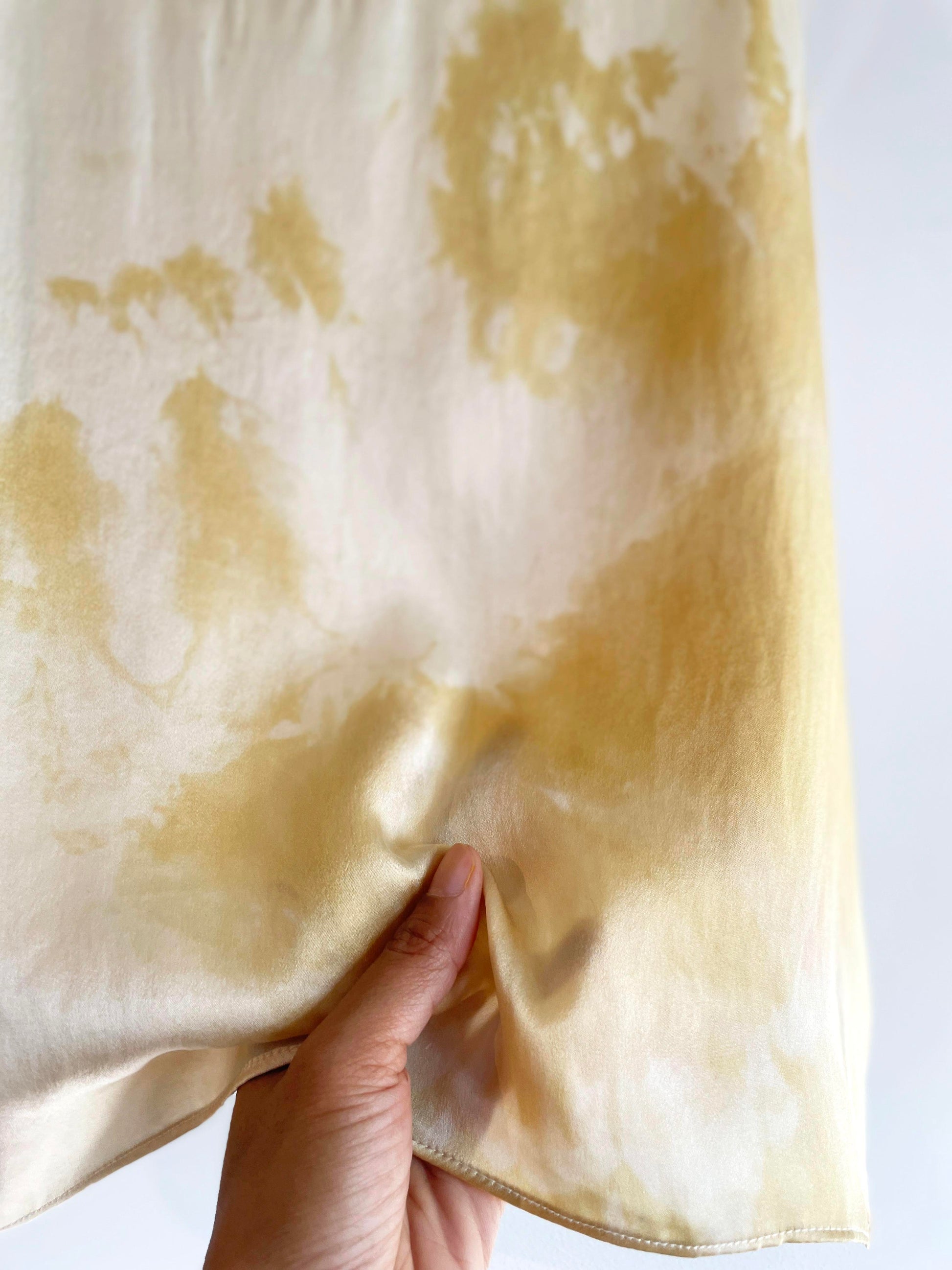 Our one-of-a-kind series, CAROL is a 100% silk crepe de chine ice-dyed with pomegranate and botanicals. Each mark is the result of a botanical stain captured in time; no two piece is ever the same. Our silk items are made in Singapore with the most delicate workmanship - pin hem with french seams on both layers.